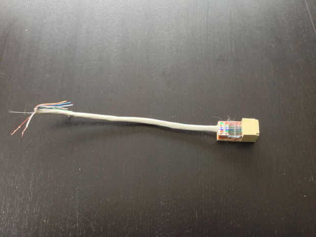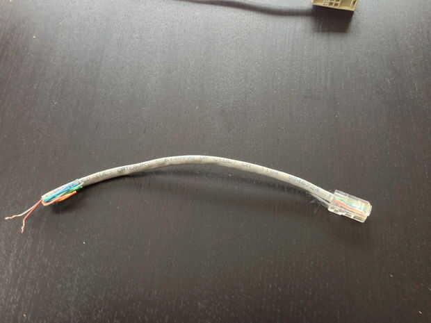 Para esta sección agarré un gato hembra y cableado con una longitud corta de 6" de cable CAT5, y para salvar a la hora de hacer un macho realmente corto sólo cortar el extremo de uno de los cables extras que teníamos alrededor. También tuvo una pequeña sección de CAT5 y recortar sólo el par trenzado (en este caso sólo utilizaré el par marrón/marrón y blanco) para utilizar en caso de que tengo dos hembra y dos conexiones macho prueba (esto no se utilizó en este trabajo, pero mantendrá con el probador para futuros trabajos).