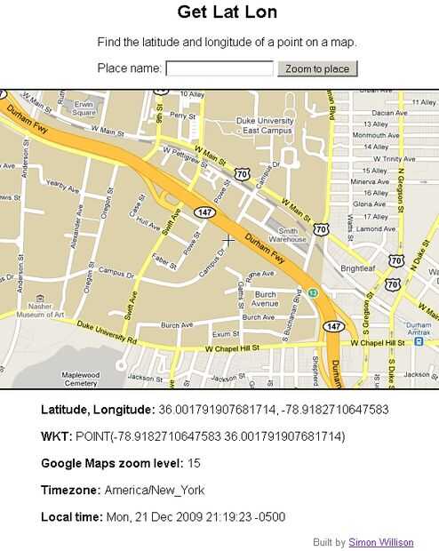 Latitud y longitud se pueden determinar con www.getlatlon.com de la trabajadora Simon Willison.