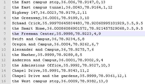 Queremos un separados de una coma cinco columnas donde cada fila es un punto a lo largo de la ruta de archivo de valores (CSV) (ver la imagen de abajo y el archivo adjunto un ejemplo--debe abrir en Excel o algo como el Notepad ++). Puntos de referencia son totalmente de su elección (Hola, huevos de Pascua) y puede agregar cualquier número de ellos en el archivo. El autobús que estoy describiendo toma un lineal a ruta B ida y viaja entonces B a la A en el exactos mismo caminos. Las entradas para cada uno de mis puntos de referencia son los siguientes: