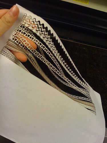 La configuración de corte láser que utiliza debe cortar el papel y la tela sin quemando a demasiado exceso tejido. Para nuestro lasercutter (Universal muy viejo) significa los siguientes ajustes: