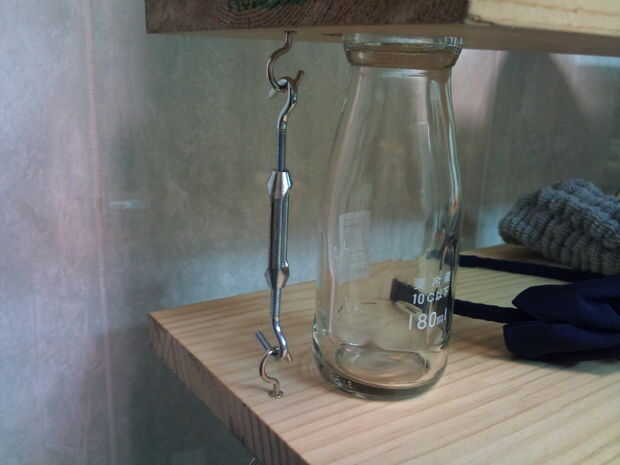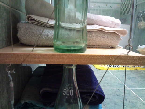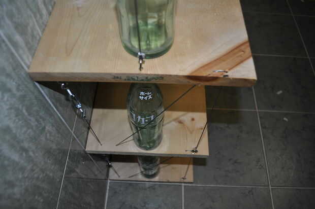 Después de seco todo lo accesorio es el momento de añadir los cables y sujetadores para hacer los estantes más estable. Ésta era la manera más fácil y más barata pude configurar los cables, ganchos y tensores para utilizar la menor cantidad en cada estante. Hay muchas configuraciones diferentes se puede utilizar que logren el mismo objetivo. Perforó los agujeros en el ángulo donde el cable pasa a través de la madera. Lo hice para aliviar la necesidad de un gancho en estas áreas. Cuando apretar Asegúrese de sólo poner suficiente tensión para mantener la plataforma estable, que no desea romper las botellas o la madera. Después de todos los estantes se fijan volver atrás y comprobar la tensión en cada estante otra vez porque las cosas tienden a asentarse después de tiempo.