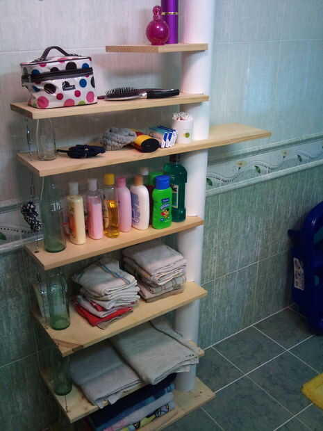 La fase de construcción está completa! Ahora todo lo que tienes que hacer es cosas de lugar en la plataforma a partir de los elementos más ligeros y su forma de trabajo para arriba. Este estante es mi cuarto de baño más parte sólo toallas y champú, botellas se va en él. Estoy seguro de que usted podría conseguir una carga de 20-30 libras en los estantes no hay problema.