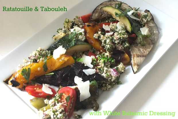 Nuez y suave tabulé es una ensalada deliciosa trigo mezclada con verduras a la parrilla mediterráneas juntos mezclando sabores viejos y nuevos.