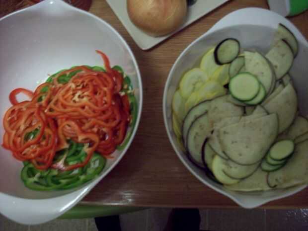 Cortar los pimientos, calabacines, calabazas y berenjenas con la mandolina. Las rebanadas deben ser 1/8 pulg de grosor. El espesor puede variar ligeramente pero no se preocupe, aún podrá degustar gran. También, colocando la mandolina sobre un tazón de tamaño mediano facilita la captura de vegetales.