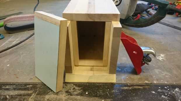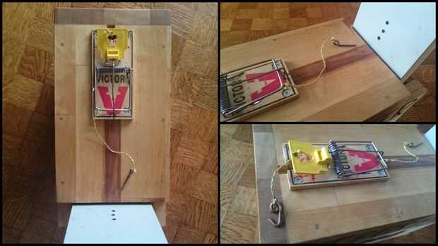 Finalmente atornillar trampa de ratón, añadir gancho perno y el gatillo de la puerta. Pequeña perforación en la puerta (no ir todo el camino a través de). Taladre un agujero grande (10 mm) en la parte superior (cerca de la pared posterior pero no contra él para que el gancho podría colgar suelto)