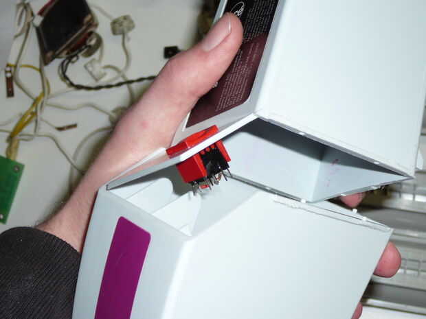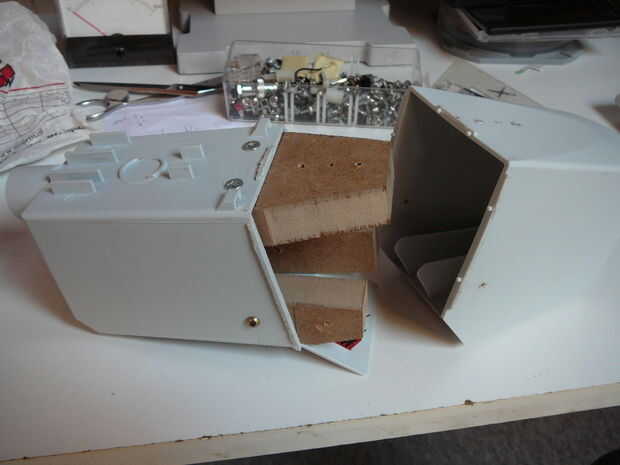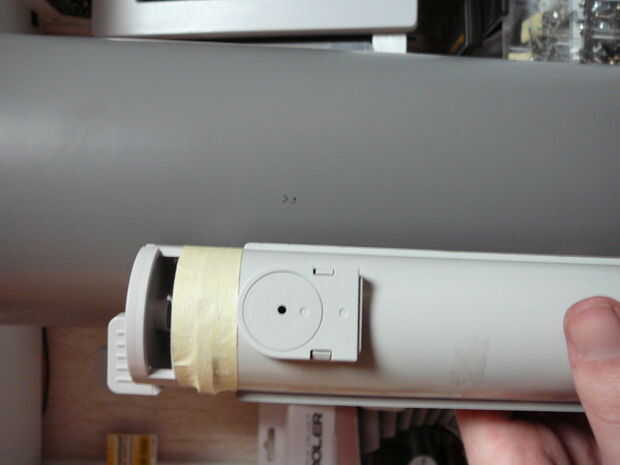 A continuación montado algo de madera en el cartucho de tinta para hacerlo mucho más fuerte y cerrar todo otra vez con unos pocos tornillos. Y ahora puede instalarse en la tubería, desde el exterior.