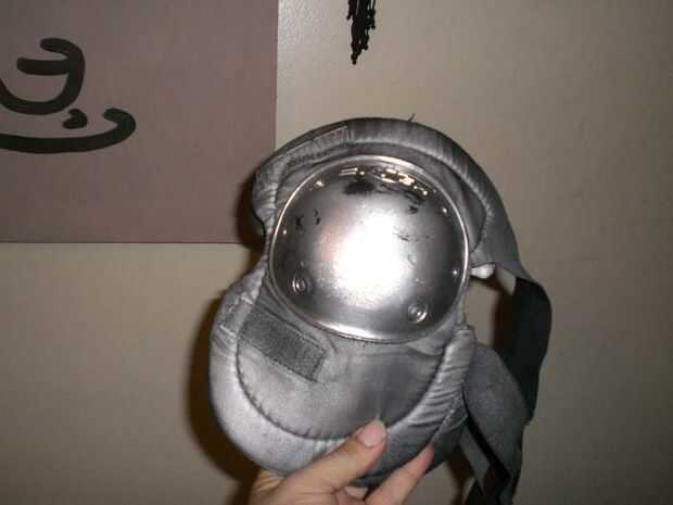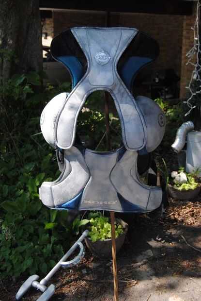 Arrancó el acolchado de algunos viejos pantalones de hockey para la armadura de la cadera y la cola, tuve algunas rodilleras viejo, luego tuvo suerte en algunas fijaciones de snowboard para hacer botas de vuelo estacionario de plata que robaron de 3$. Todo lo consiguió plata pintada que comió 2 latas de pintura en aerosol plata.