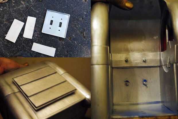 Clank tiene airvents en su vientre. No pude encontrar una versión ligera de este que era pequeño y barato, por lo que había fingido. Tengo una vieja placa de interruptor doble y cortar unos rectángulos de madera desde el lado de una caja de madera Clementina naranja que encontré en la basura del vecino. SprayPaint todo plata primero. La ciu lightswitch tiene 4 agujeros para montarlo, así que usaron y atornillados a la barriga. La madera no caliente pegamento al vientre bien tomó algunos cartulina y pegado algo de tela sobre ella y deshizo los pernos y atornillados a través de eso. Luego los listones de madera de aire caliente pegan en bien.