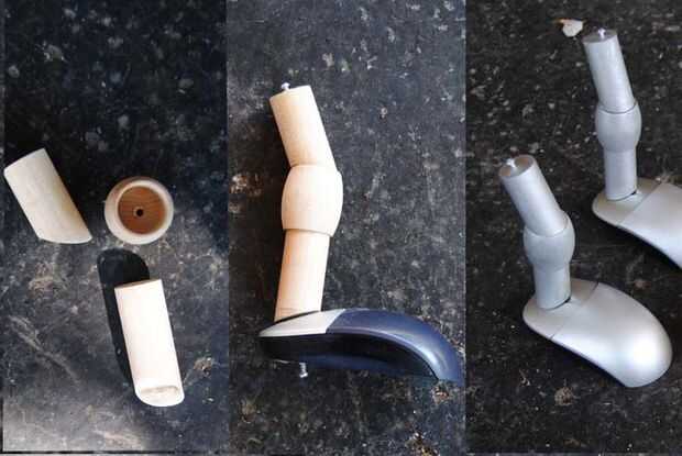 He utilizado ratones de ordenador para pies (vaciar la electrónica, la rueda y el cable hacia fuera) que estaban ya grises y negras, lijado y pintado sobre el logotipo de dell. El agujero donde va la rueda estaba en un lugar útil para un pequeño agujero en la parte inferior y acaba roscada en el pasador.