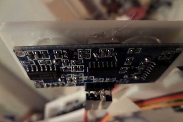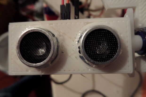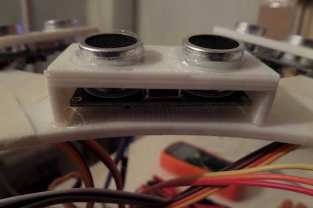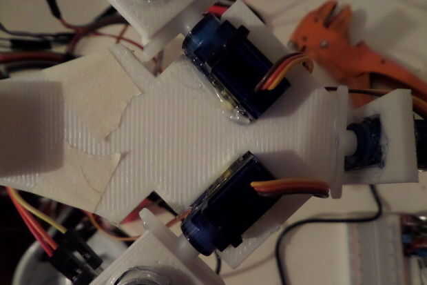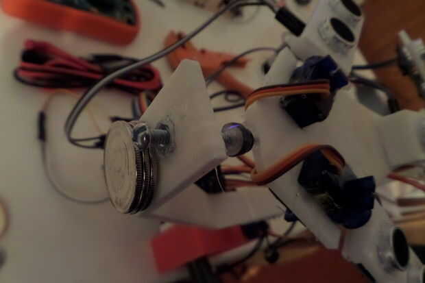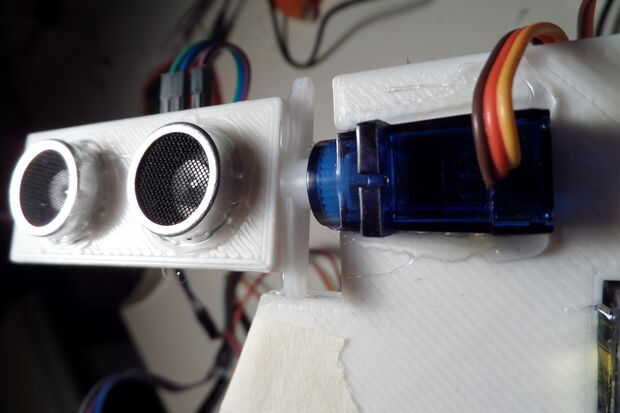 Pegue los 4 servos en sus casillas correspondientes. Debe pegar a la estructura en su centro. Cinta adhesiva o pegamento sus cables en la parte trasera. Pegue la central telémetro ultrasónico en el centro.