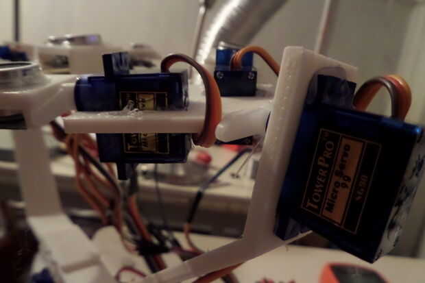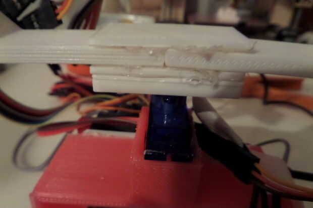 Pasar los cables de servo en el agujero del soporte, luego pegue el servo a él. Usted puede poner una abrazadera para fijar el robot en una tabla. Además, puede pegar el arduino a él mediante un 3D impreso de apoyo.