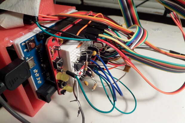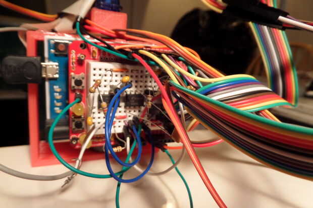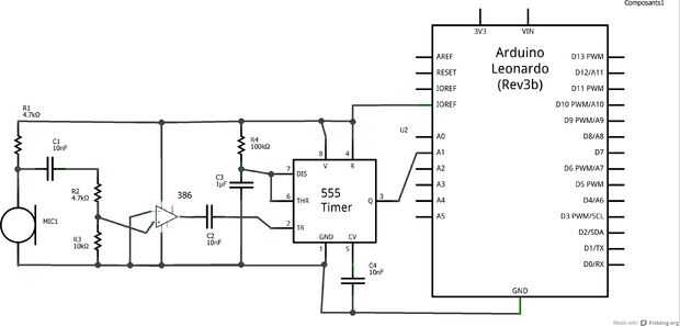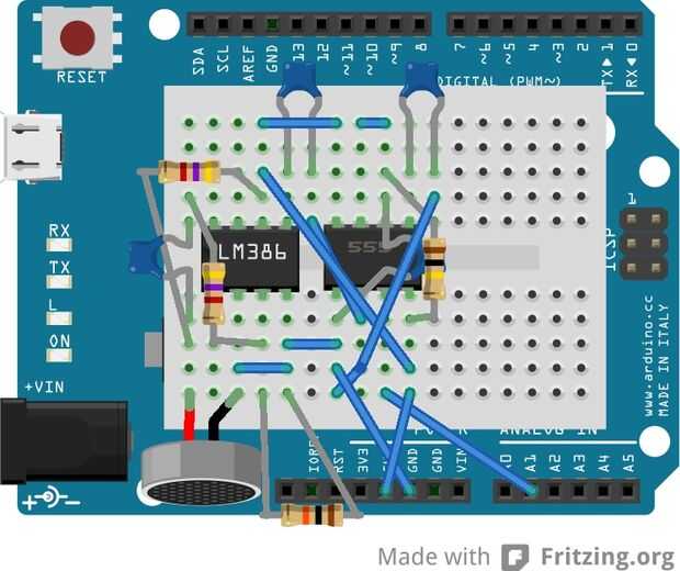 He apuntado una foto de mi protoboard junto con esquemas. Es un poco compacta, que se puede ver que el espacio no utilizado en el protoboard shematic es en realidad llena de cables de alimentación para los servos y los sensores. Ya que hay no hay guías de suministro en un protoboard mini, es más difícil entender el circuito y para solucionar problemas. No se trata de un circuito complejo, tómese su tiempo y todo irá directo. El divisor de tensión antes de que el LM386 puede ser sustituido por un potenciómetro de ajuste para un control más preciso sobre la sensibilidad del micrófono.
