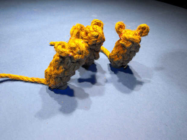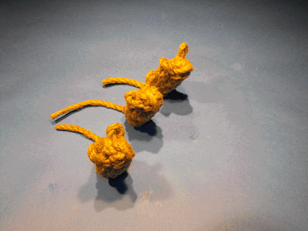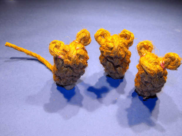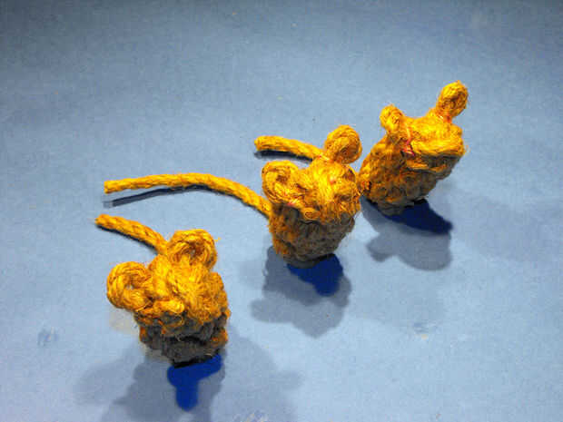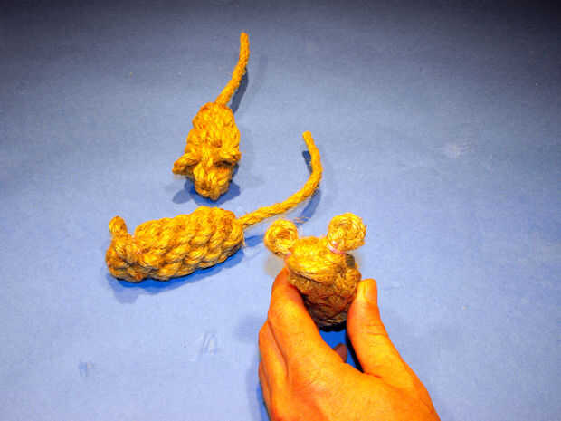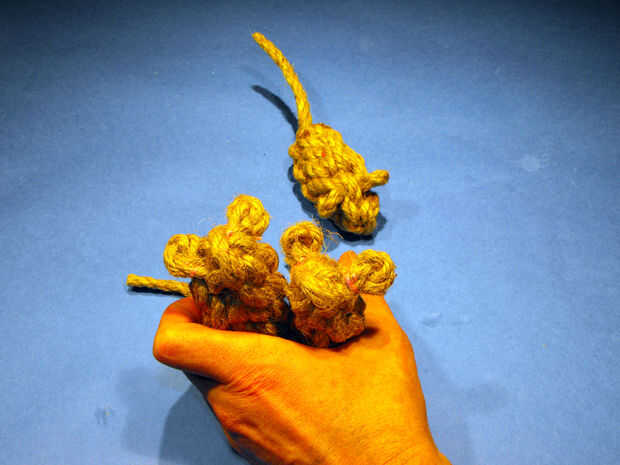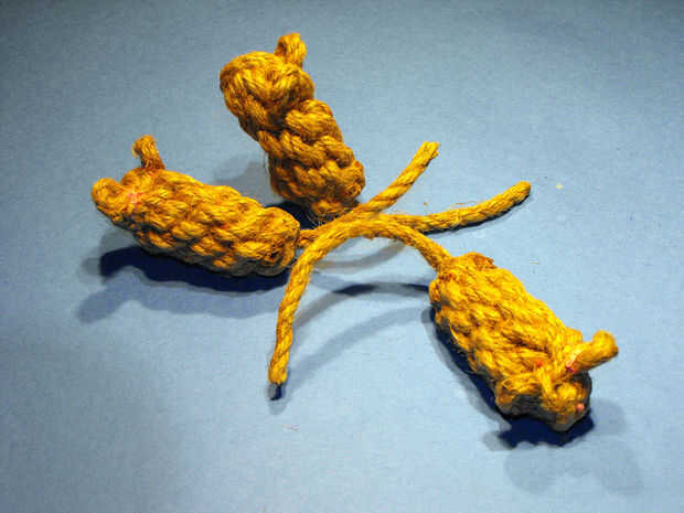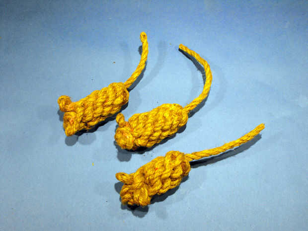 basado en mi ratón con nudos instructivo original para gatos buena esta versión de video utiliza 3/8" cuerda de nylon, produciendo un mayor ratón acabado más colorido.Cortar dos 4' longitudes de cuerdaCortar un 3' longitud de la cuerdaCruzar las dos