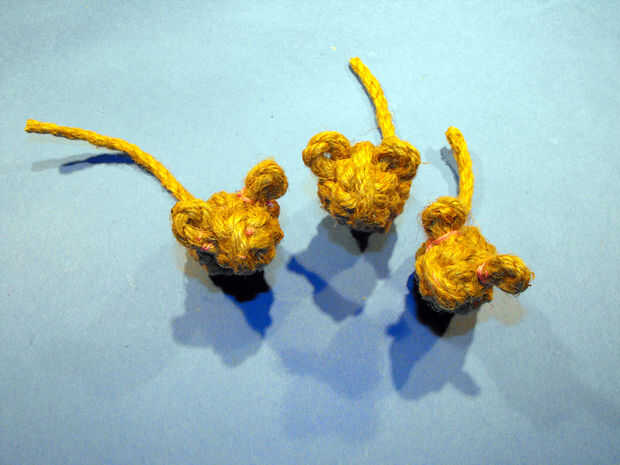 he hecho algunos de estos ratones para todos los gatos en mi vida. Son gato-probado y aprobados!Estos puede hacer con cualquier hilo de desecho (esto era algunos restos León marca lana) tamaño 8 dpns y un patrón de la puntada y puta nación.