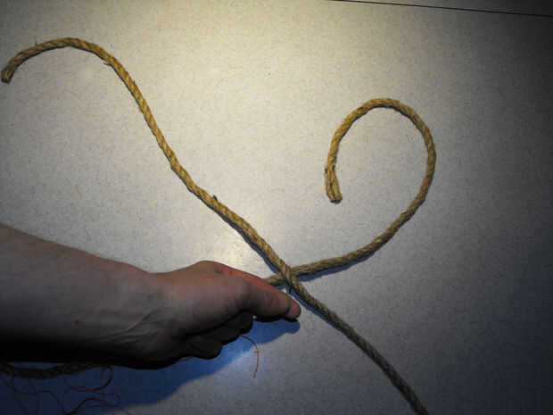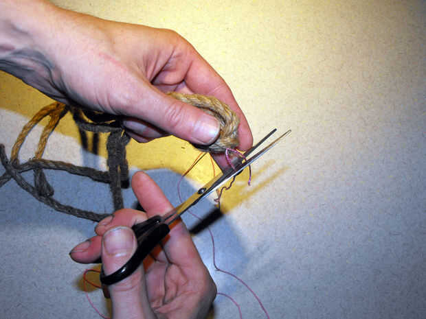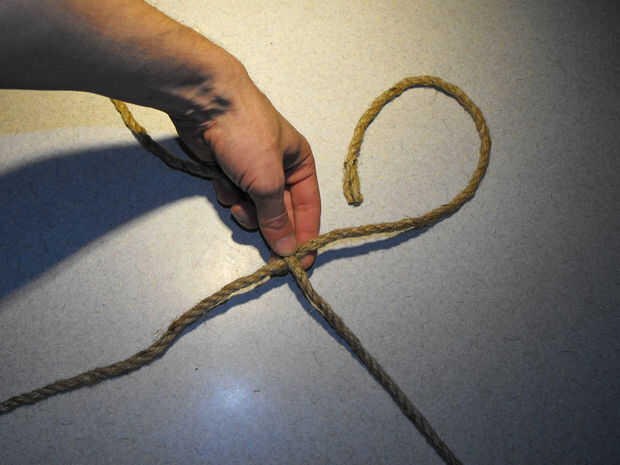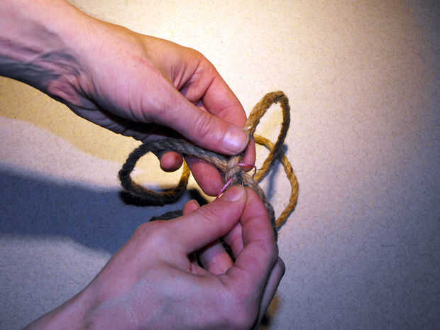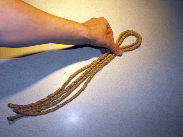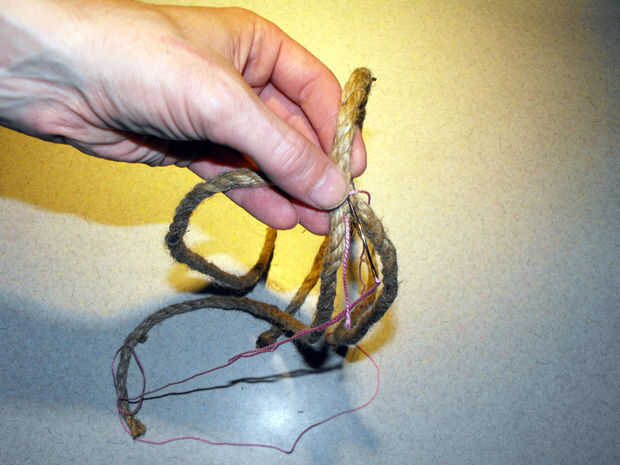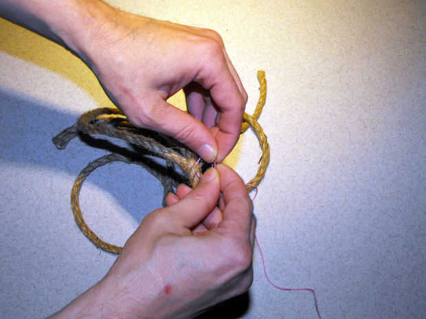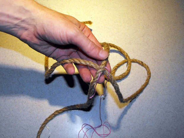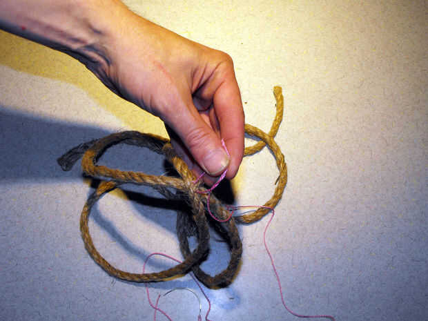Encontrar centro de dos 3' longitud de la cuerda doblando por la mitad y coser juntas en forma de cruz con unos puntos de sutura rápidas.