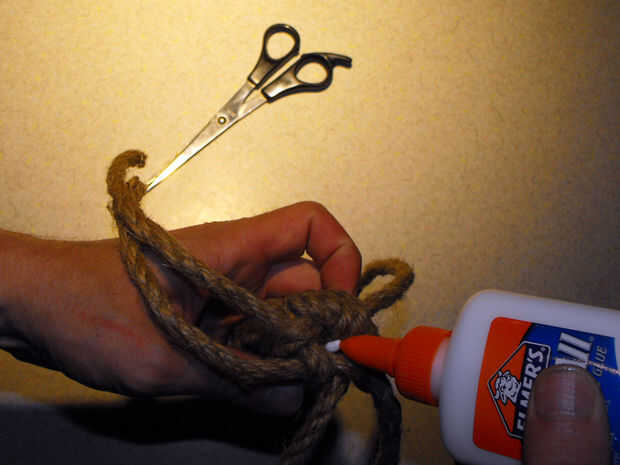 Crear cola de ratón y quitar una cuerda recortar cuerda más corta y metiendo dentro el centro del nudo terminado. Aplique pegamento blanco y usando la cuerda enfrente de cuerda que sólo fue escondido en meter en el mismo agujero en la base de la cuerda (no corte este es cola de ratón) y aplicar pegamento blanco.