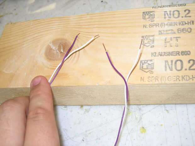 Estoy usando cable CAT5 viejo, sin chaqueta, para mi el cableado. Cualquier cable de núcleo sólido fino debería funcionar. Tomo el CAT5 y separar en pares de color o "giros" de alambre de gancho-up barato. Corte una longitud de 14" de un giro. Debe tener dos cables trenzados entre sí. Desdoble de los extremos aproximadamente 1,5 pulgadas. Tira de 1/4" de aislamiento de los cuatro extremos.