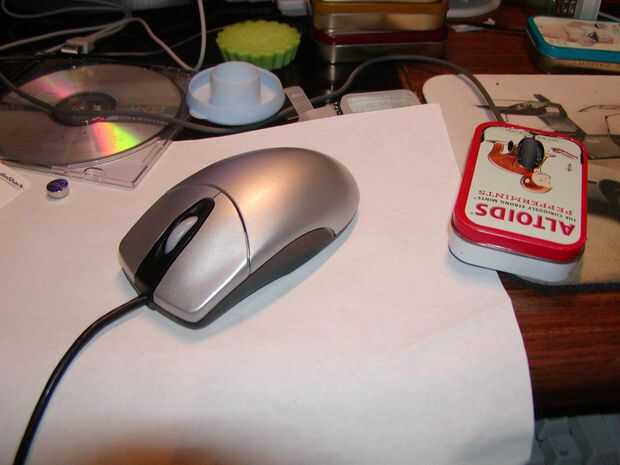 Utilicé un barato ratón de marca Belkin $10 de Office Depot, y un azul led (3.4V 8000mcd).