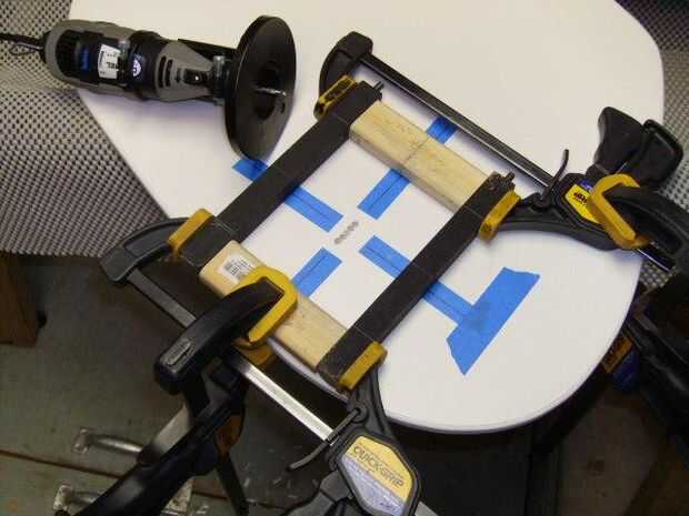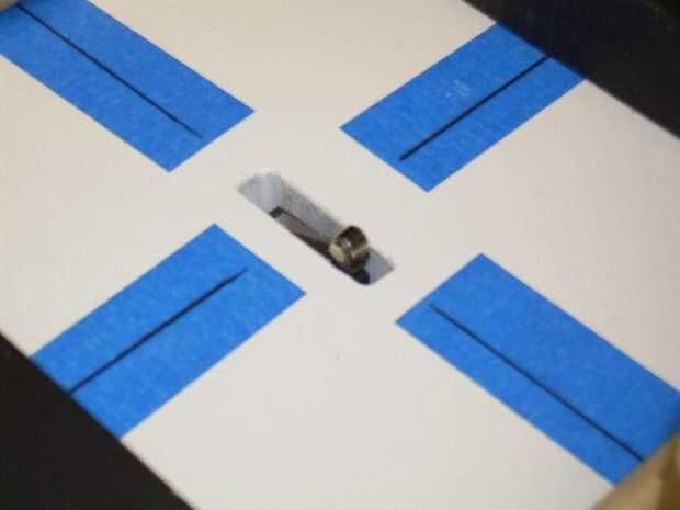 Foto 4: ranura se limpia utilizando herramienta Dremel con broca y router accesorio de la espiral. Bloques de madera cortada y lijada a longitud definir el ancho de la ranura de 0,25 pulgadas, para un ajuste deslizante con el interruptor, y la distancia entre ellas define la longitud de la ranura en una pulgada. Presentó a dos semillas pequeñas en los lados de los interruptores para hacer incluso con los jefes que rodean los orificios de montaje de los interruptores.
