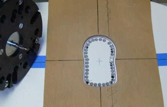 Foto 6: la apertura se perfora y el tapón de madera aserrada hacia fuera entonces se limpia utilizando router muchacho grande con control de velocidad, broca espiral y collar patrón siguiente. Por razones estéticas que esperaba para instalar el ratón en un hueco en la superficie inferior del tablero de pie, con su ombligo mágico mirando para arriba a través de una pequeña apertura. Esto no funcionó porque el pie debe estar muy cerca de la barriga del ratón para el control del puntero óptico. No hizo provisión en el hueco para alojar el tapón de goma que proporciona retenedor de cable del ratón, sólo de peluche el tapón completamente hasta el agujero del cable del ratón.