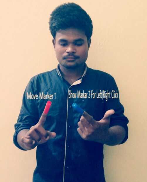 Clic en la acción se basa en la detección simultánea de colores. Para el movimiento del cursor se detecta el color rojo. Para realizar clic izquierdo se detecta el rojo junto con el color azul. Para click derecho se detecta la roja junto con dos stips de color azul.
