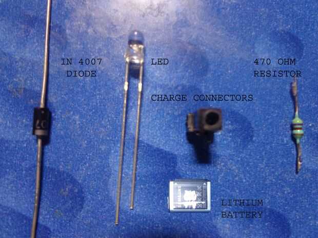 @ Diodo 4007 en -1 @ LED (color rojo para la carga indicación) -1 @ carga conectores -1 @ batería de ion de litio (800-1500mah) @ el resistor de 470 ohm-1 @ pegamento caliente @ PCB board