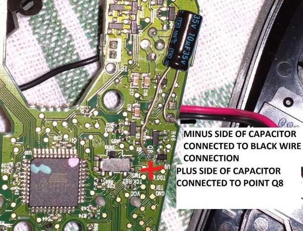 -la soldadura más parte del condensador hasta Q8 en parte inferior de la PCB, menos la parte de conexión de cable negro (cable usb). Vea la foto para obtener más información.
