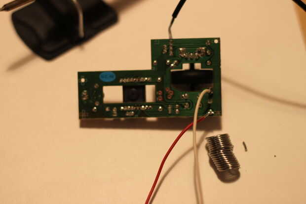 Ahora a soldar el otro extremo de los cables a los puntos de soldadura para el interruptor del botón izquierdo del ratón. Realmente usted debe usar un multímetro como se recomienda en el instructivo que se hace referencia en la parte superior para ver que puntos en que debe soldar la soldadura. Esto le indicará a usted que la soldadura de puntos permitirá actual atraviese cuando el interruptor está cerrado. No tengo un polímetro, por lo que adiviné... incorrecto. Tuve que tomar esta aparte y resoldar los cables. El cable rojo es correcto en la imagen, el cable blanco deben ser trasladados al centro de la soldadura de punto.