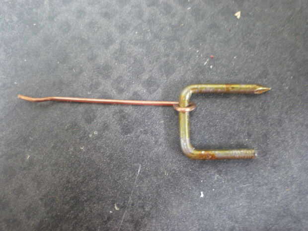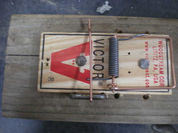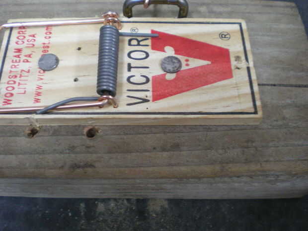 Ahora es el momento para construir lo que llevará a cabo la mousetrap(claymore) de activación. Tomar la barra desde el paso 2 y agrande el agujero en un lado con los alicates. Luego, deslícelo sobre la grapa super, asegurándose de que puede deslizarse fácilmente. Luego perfore 2 agujeros poco profundos junto a lo mopusetrap en el lado de "Víctor" al lado de la "R". Taladre los orificios tan distantes como las piernas las grapas super así que cabrá en los orificios con la barra. Clávelo en que existe un vacío de 1/4 de pulgada de la grapa a la parte superior de la ratonera.
