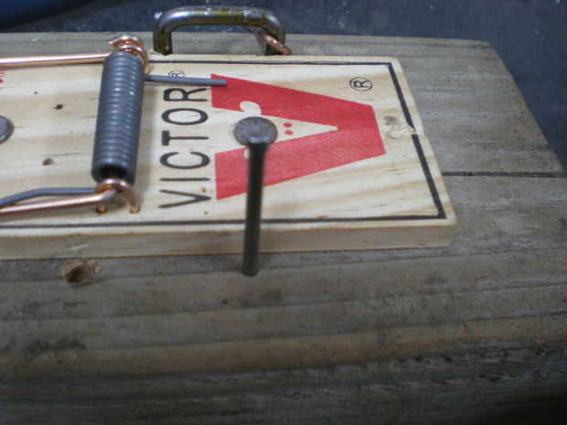 A continuación vamos a poner un clavo para sujetar la barra de. Tome su brad de tamaño medio y clavo medio en el lado de "Víctor" al lado de la "V" paralelo al otro clavo. Luego doblar el brad un poco menos de 90 * lejos de la "V". Ahora ya podrá tire hacia atrás el brazo y poner la barra a través y debajo del clavo para fijar la claymore.