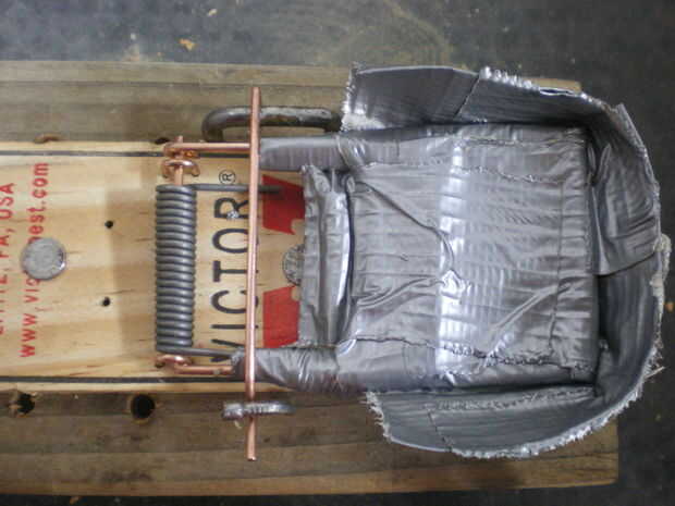Ahora hacer un bolsillo fuera de cinta adhesiva para mantener el BB. No tiene que ser elegante, siempre y cuando hace el trabajo. Luego, atar una cadena a la barra en el brazo del oscilación que el tripwire. Puede tomar algunos ajuste para hacer el tirón de la cuerda menos, así que si usted necesita, sólo ajustar el clavo doblado a un ángulo diferente para cambiar el gatillo.