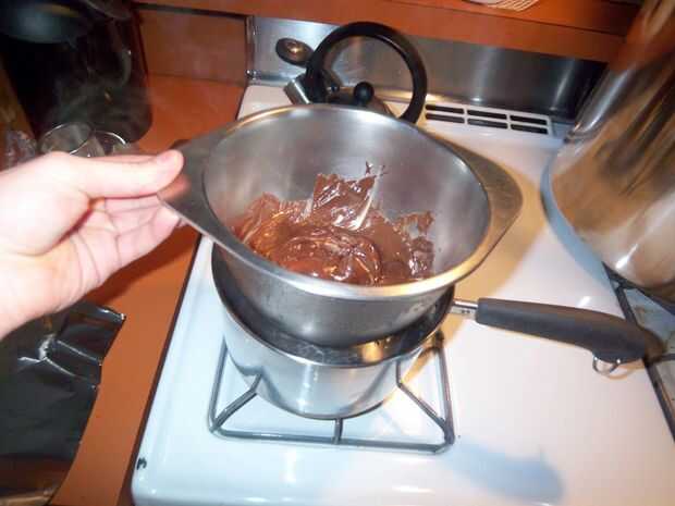 Poner la caldera de doble en la posición más baja de la estufa y dar el agua un rato para calentar para arriba. Añadir el chocolate. Asegúrese de que no entre humedad en el chocolate, puesto que hace poco grumos que desmerece la presentación general.
