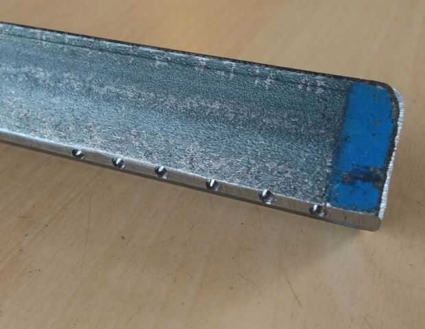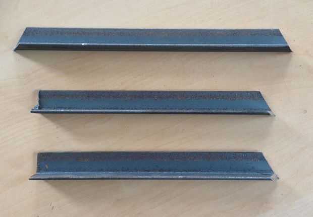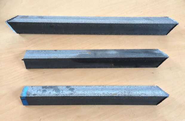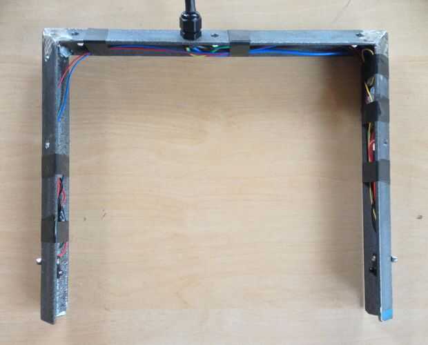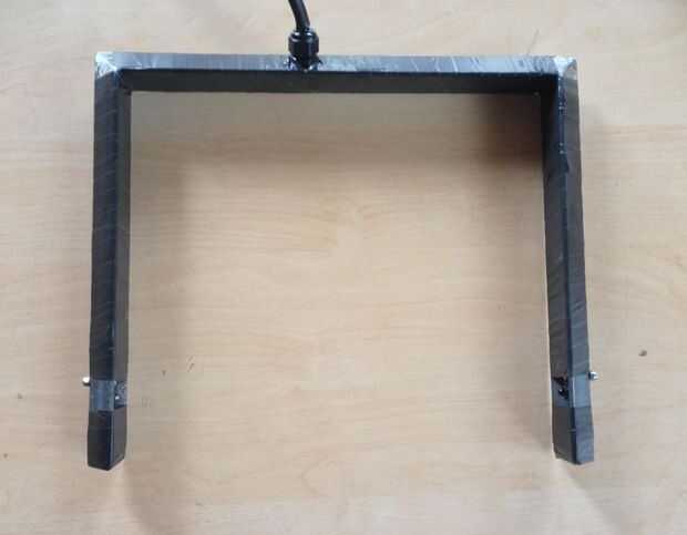 El chasis de viga de la rotura se hacen por ángulos de 45 grados en los extremos de las longitudes individuales de corte y soldadura de juntas como en las fotos anteriores. Los sensores tienen agujeros de pequeño 3mm perforados que permite ser atornillada en el interior del ángulo con un poco de ayuda con un archivo. De esta manera las lentes delicadas están protegidas de ser roto cuando se instala en la jaula y ser atacado por las ratas capturadas.