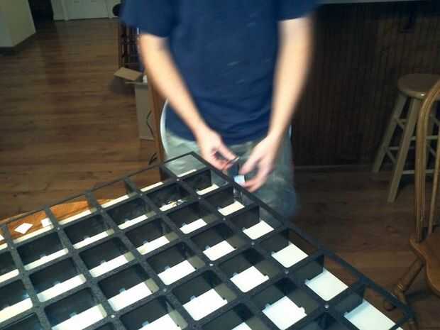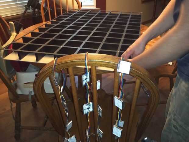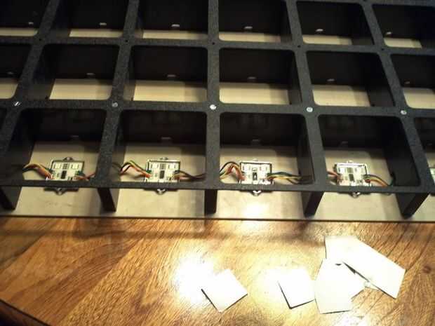 Una vez que los módulos LED están plantados en el panel inferior, es el momento de poner sobre los marcos de corte para establecer la luz 'cajas' o 'píxeles'. Los agujeros en el fondo panel (panel superior) nos permitieron poder atornillar los recubrimientos superior e inferior a los carriles ellos mismos y hacer toda la estructura mucho más sólida y para evitar desplazamiento aparte.