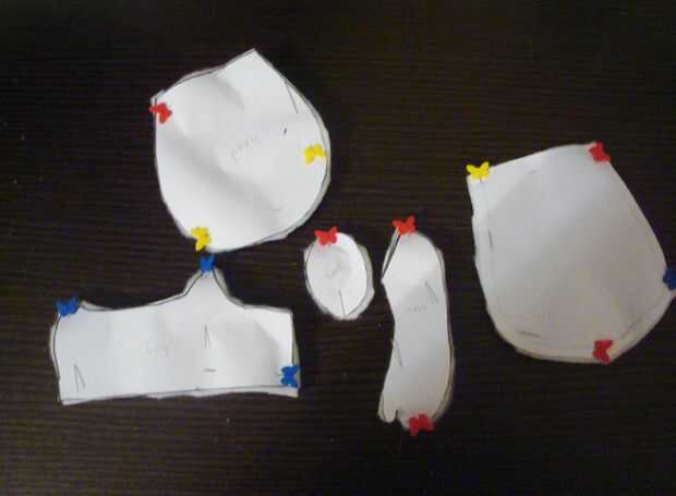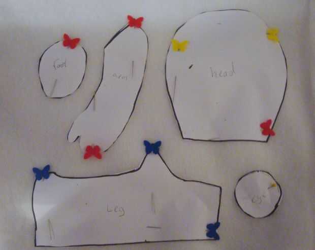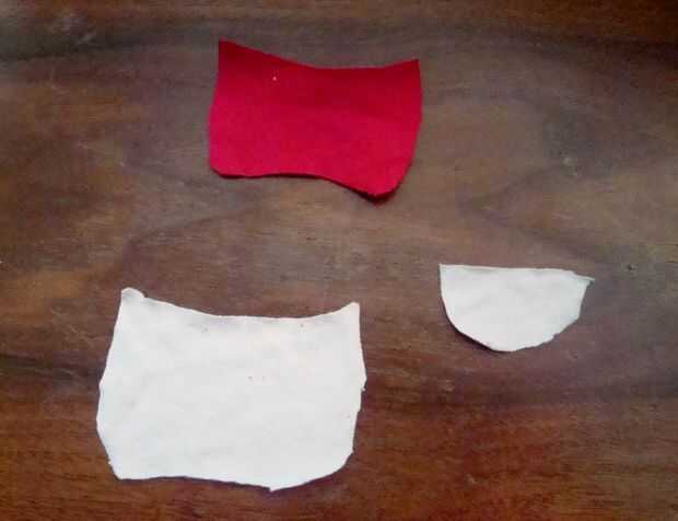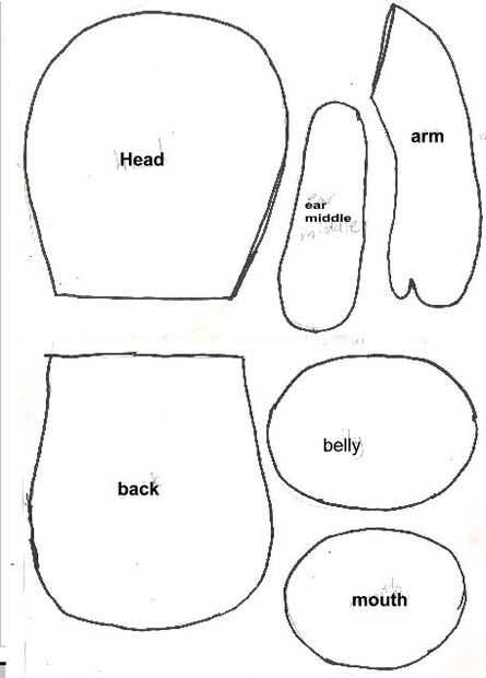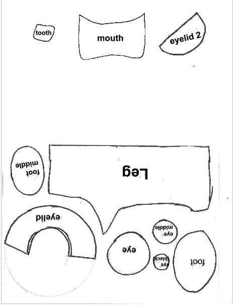 Imprimir los patrones de los cuadros. Corte estas piezas con tela blanca: cabeza-2, cuerpo frente-1, brazo-4, 2 pies, pierna-2, oído-4. Cortar con la tela rosa clara: Centro de pies media-2, párpado-2, 1 boca, vientre-1,-2 del oído. Otras piezas: media-2, blanco de ojo azul o rojo: dientes-2, 2 ojos, negro: Centro de ojos-2. Piezas de locura rabbid: rojo: 1 boca, color de rosa: cortar el patrón de la boca un poco más grande que la pieza roja.