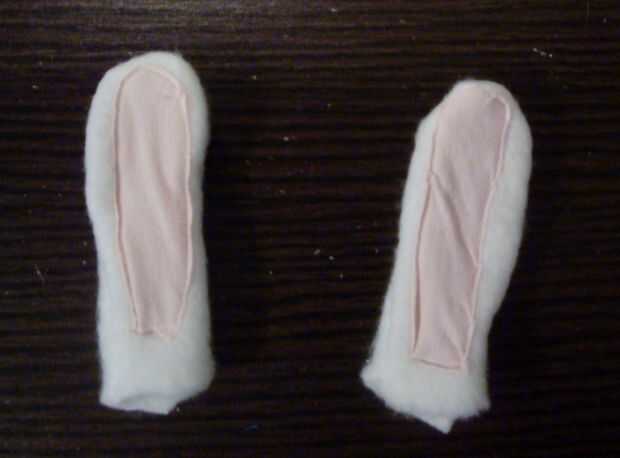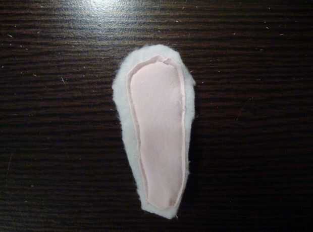 Coser la pieza del oído medio rosa al frente de un pedazo de oreja blanca. Otro pedazo de oreja blanca del perno en la parte superior y coser alrededor de los bordes excepto la parte inferior. Girar las orejas hacia fuera.