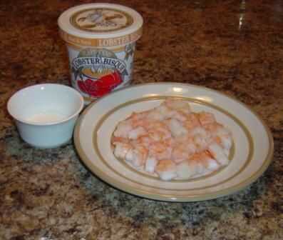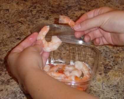 Si usas langosta o cangrejo de carne, debe estar plenamente preparado ya. Sin embargo, para este ejemplo elegí camarón porque estaba a la venta. Fue ya desvenado, pero necesita la cola eliminada. También corte porque aunque se ve más agradable todo es más fácil de cortar.