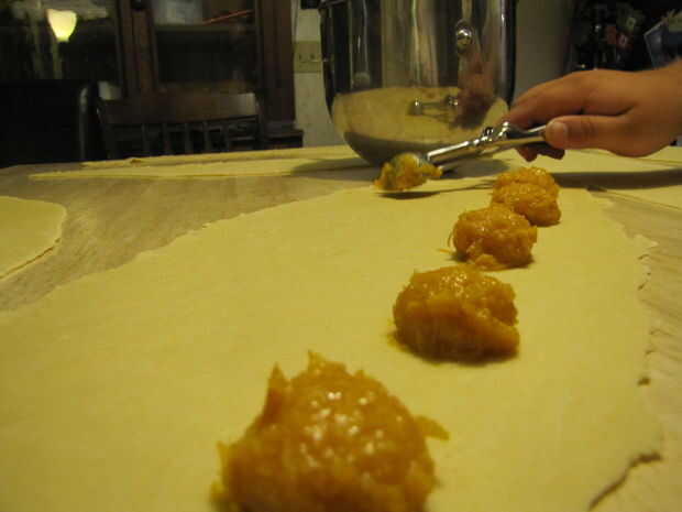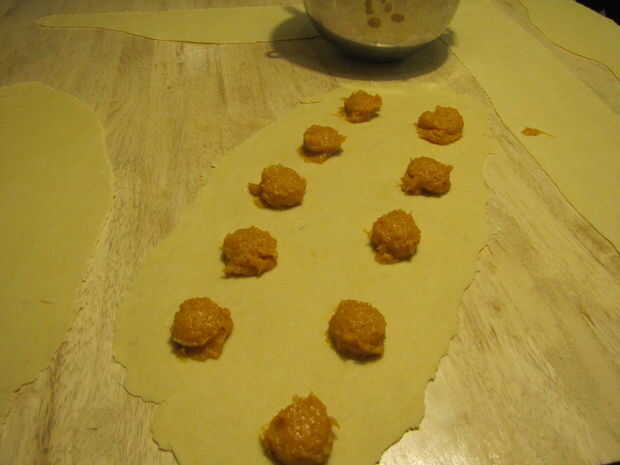 Una vez que todos los raviolis se recortan puede re rodar la masa para hacer ravioles más.