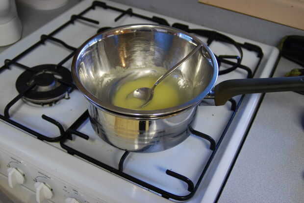 • Coloque un tazón sobre una olla de hervir suavemente agua. Tenga cuidado de no permitir que el agua toque el fondo del recipiente. Añadir la derrite chocolate blanco y la mitad de la crema espesa. Remover continuamente hasta que el chocolate se derrita y la mezcla es lisa. Retirar del fuego y dejar de lado que se enfríe un poco.