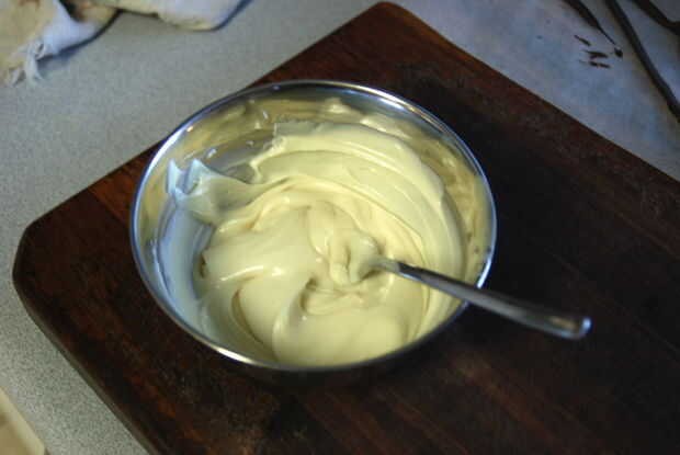• Mientras tanto, utilice un tenedor para batir el mascarpone, la vainilla y la crema restante.