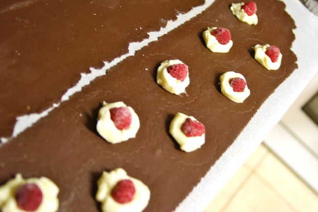 • Coloque una pequeña cucharadita de la mezcla de mascarpone sobre cada ravioli y presione suavemente una frambuesa en el centro. No más cosas les. Si estallan durante la primera etapa de la cocción será incapaz de completar la segunda etapa de la cocción. También es una buena idea para hacer piezas de repuesto en caso de que esto sucede. Me permite 3-4 por persona dependiendo de lo grande hace. Dejar de lado cualquier restante mascarpone chocolate blanco cuando sirve.