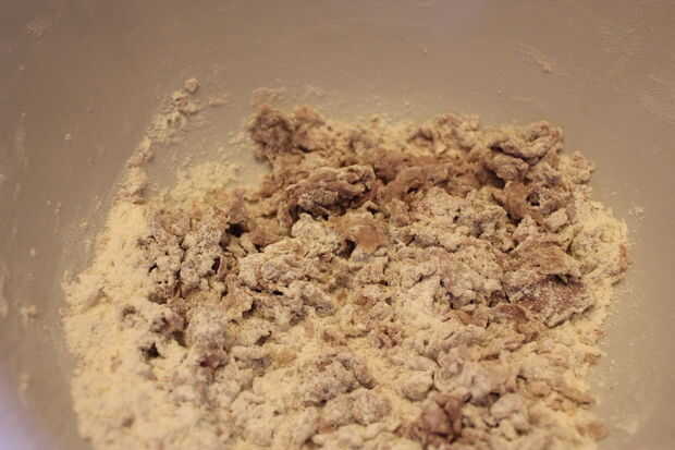 Hacer un pozo en la harina, sal y pimienta e incorporar el vino y el aceite (mezclada)