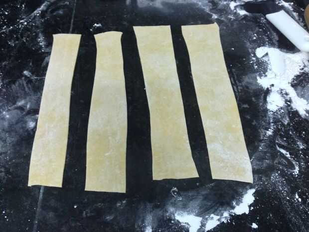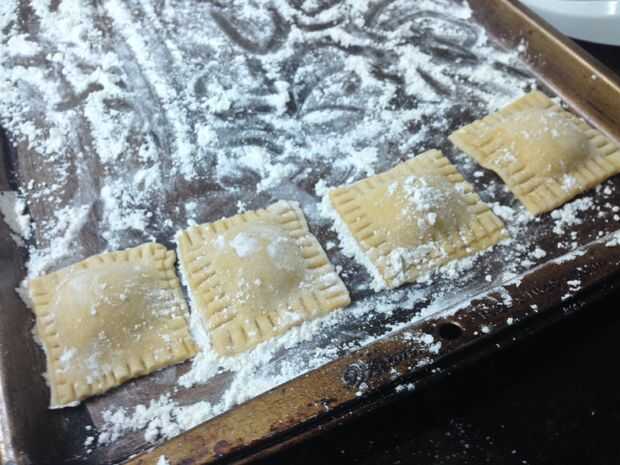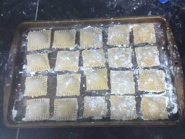 Para el montaje de sus raviolis que simplemente estirar la masa en hojas finas, no tengo una máquina de pasta que diluye mi hojas así que tuvo que hacerlo a mano y con un rodillo, extienda una hoja grande y zambullido en cuatro tiras largas. En dos de las tiras se coloque la cantidad de relleno que desee y cerrarlos con las tiras restantes, después de que utilizando un tenedor cerrar el ravioli y hacer un patrón que se ve muy bonito. Esta receta rindió unos cuarenta ravioles pero realmente depende de la cantidad de relleno y el tamaño que hacen el tuyo.