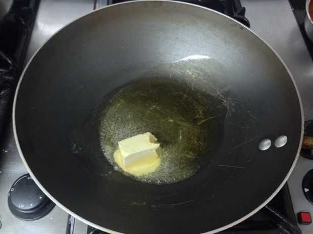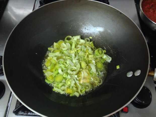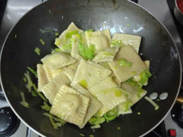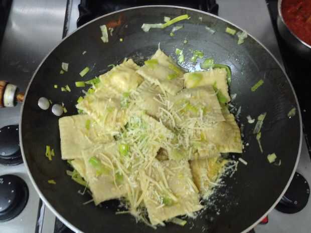 Para la salsa agrega la mantequilla en una sartén saltear grande o un wok que utilicé aquí y calor, cuando derretido le agregue el puerro restante y saltear hasta que estén suaves. Después de que estén suaves y el ravioli se cuece simplemente añadir todo junto y listo y algunas parmesano a la salsa si quieres y te son al hecho.