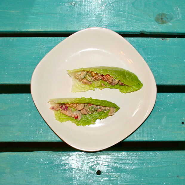 Vierta el relleno en los corazones de lechuga romana o las hojas, luego sostenga en su mano y comer como si fuera un taco normal. Yum!
