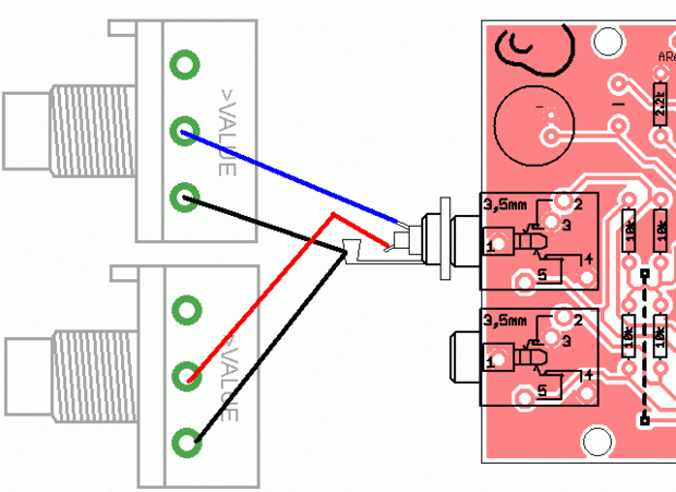 Un cable con un par de potenciómetros de 100K y un enchufe P2 se han construido para ayudar a realizar dicha prueba.