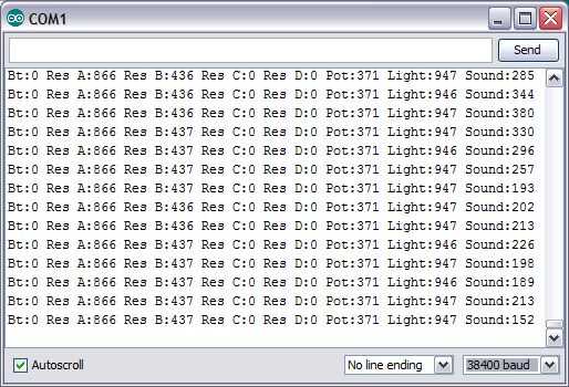 Ahora, utilizar este bosquejo para realizar una prueba general de la Junta. Lee todos los sensores y los valores de impresión en el terminal de serie. Aviso que hasta ahora hemos estado utilizando el estándar de 9600 baudios la velocidad de los dibujos de ejemplo, pero para las pruebas generales la velocidad debe cambiarse a 38400.