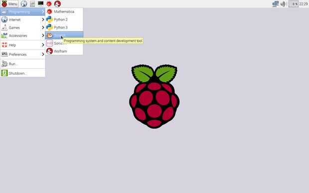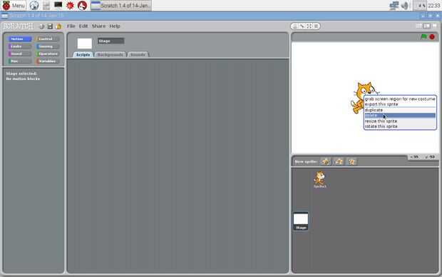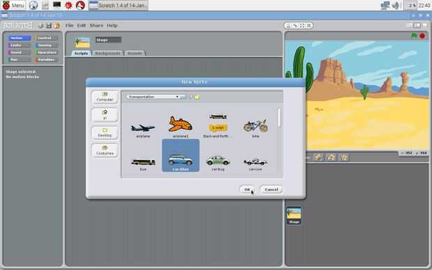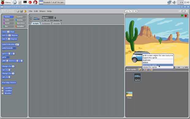 Cero abierto en la frambuesa Pi haciendo clic en menú-->programación-->Scratch. Una vez cero se abre, haga clic derecho en el sprite de gato por defecto y haga clic en eliminar. Agregar un fondo al hacer clic en la pestaña de fondos y luego importar. Haga clic en naturaleza, entonces desierto, luego OK. Haga clic en elegir nuevo sprite de icono de archivo, transporte, coche azul, haga clic en Aceptar. Haga clic derecho en el coche y haga clic en cambiar el tamaño de este sprite. La escala de abajo el coche.