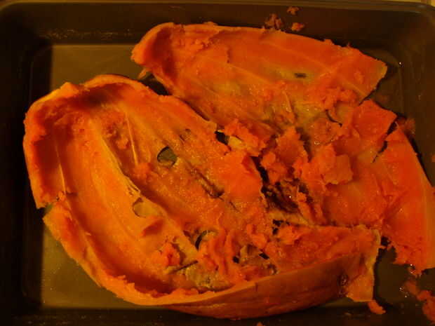 verás que es suave y comienza a colapsar bajo su propio peso, deje que se enfríe hasta seguro para manejar. luego use una cuchara para sacar toda la carne sabrosa, si aún está caliente es difícil resistir a comerlo.