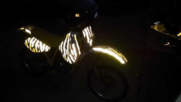 En general, el proyecto resultó muy bien. Como se puede ver en las fotos, la moto realmente se ilumina por la noche y sin duda es más visible a otros conductores. Durante el día, el vinilo como una agradable textura hexagonal algo brillante en el sol. Parece un poco ridículo, pero es la idea.